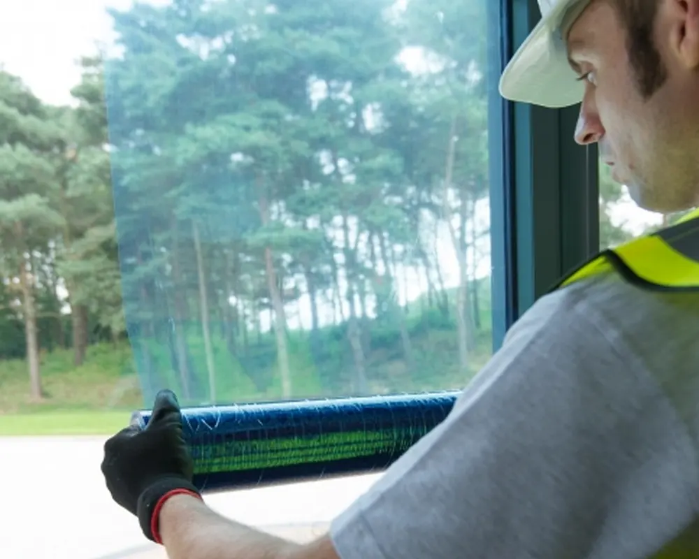Unwind 600mm of the roll and stick to the top of the window pulling the roll down towards the floor. Ensure that the roll is stuck by smoothing out by hand, then continue to roll the film whilst pulling in a straight line. Then smooth out with hands as it unwinds.
