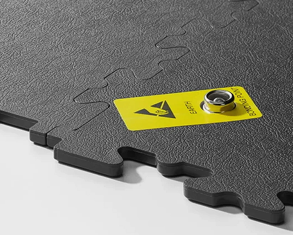 A tile with a grounding stud is installed every 60m2 and is connected to an earthing point, allowing static to complete its circuit and flow safely to ground.