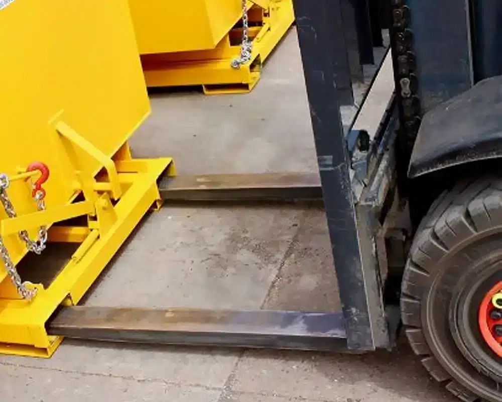 When emptying is required, the forklift operator can simply lower the tines for the skip to tip and release its contents.
